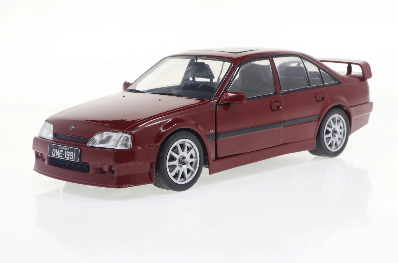 Miniatura colecionável do Chevrolet Omega CD 1991 na elegante cor bordô, em escala 1:24. Modelo feito em metal die-cast com detalhes em plástico e pneus de borracha, com portas dianteiras que abrem, capturando fielmente o clássico sedã brasileiro para colecionadores a partir de 14 anos. Perfeita peça da linha California Classics para exibição ou presente.