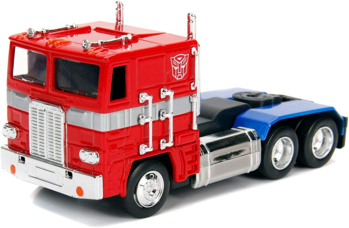 Miniatura em metal (com partes plásticas) na escala 1/32 (~13-15 cm), do caminhão do líder Autobot. Pneus de borracha, pintura fiel ao visual do filme/série, excelente para exibição — não se transforma em robô. Colecionável recomendado para maiores de 8 anos.